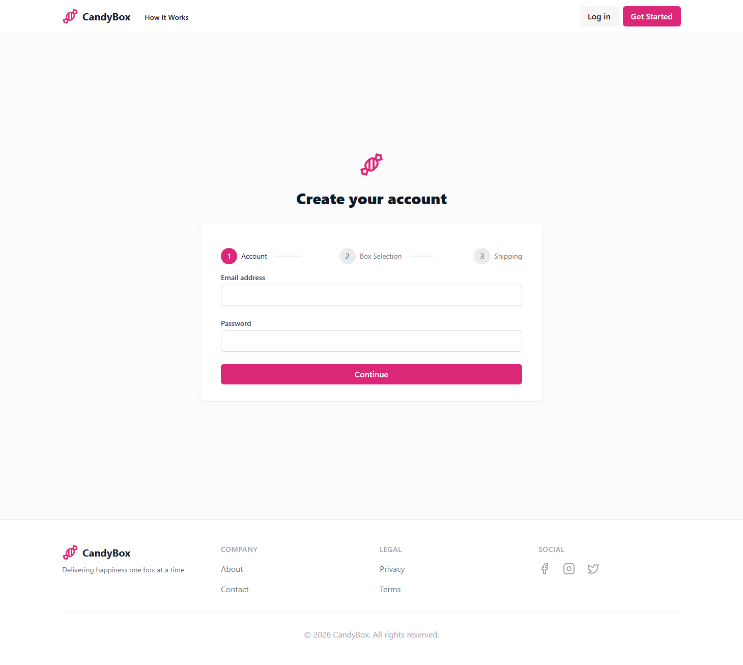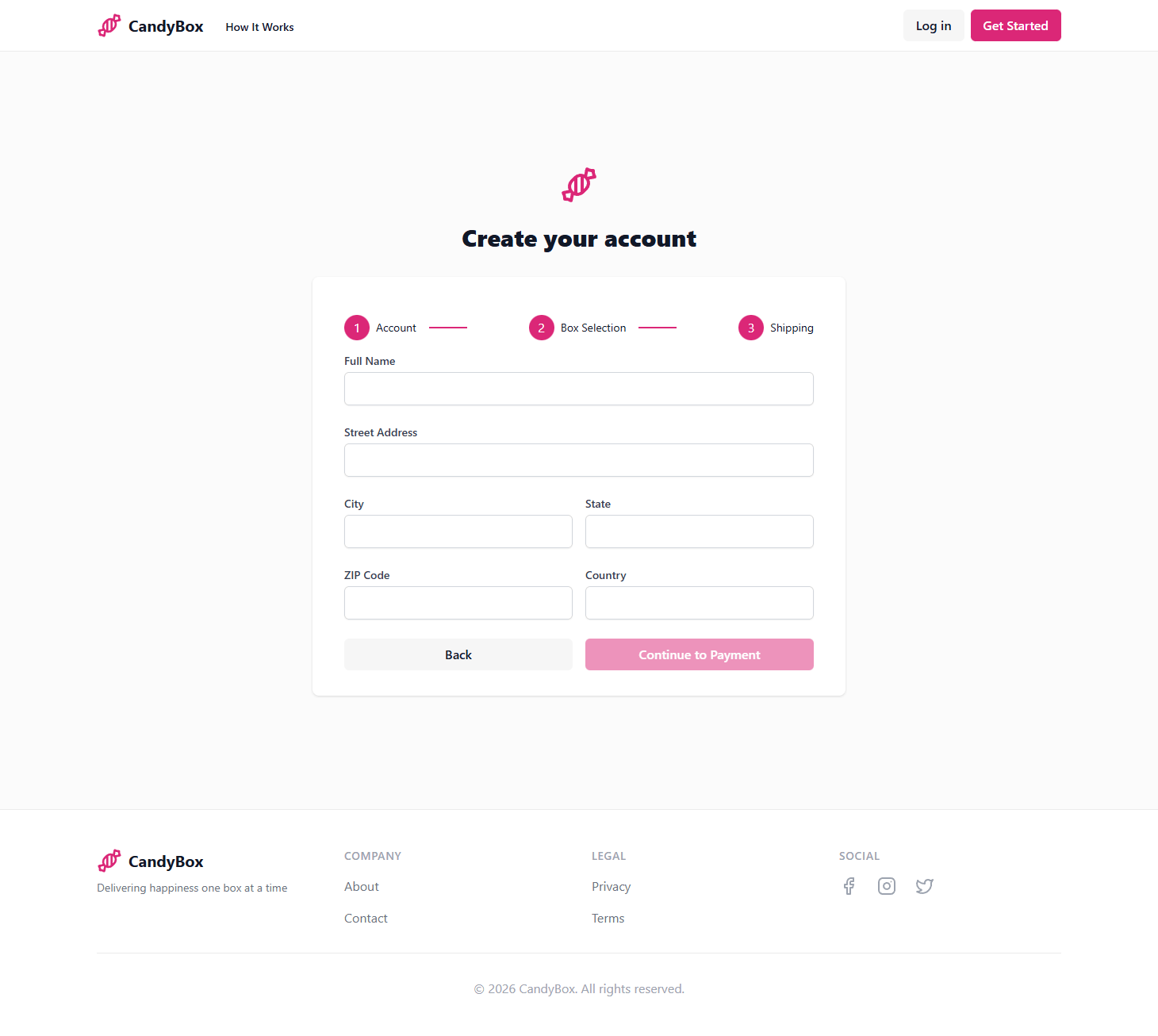 A complete subscription platform delivering curated candy boxes monthly. Users select box sizes, manage subscriptions, track deliveries, and process payments through a streamlined interface built for recurring revenue.